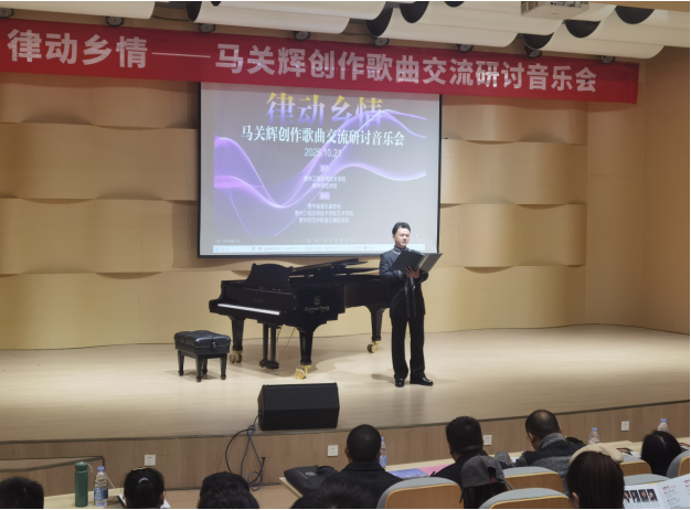 本次活动以音乐为媒,艺术为桥,通过作品展演与学术研讨相结合的方式,充分展现了贵州民族音乐的当代生命力,推动本土文艺创作与高校美育融合发展。威廉希尔中文官方网站院长马关辉教授担任导赏,以创作者视角带领观众走进其音乐作品的“一度创作空间”。他在导赏中谈到:“这些歌曲并非严格‘设计’的产物,而是从生活深处‘生长’出来的心灵日记”,生动阐释了其创作理念与艺术追求。